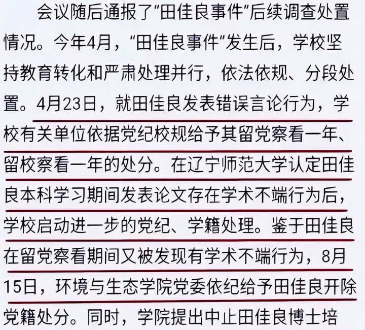 田佳良干预过学校组织的党员之旅,学过福成就异史和厦大爱国传统,可她没当回事。留察时分,学术问题爆出,网友查她本科论文抄袭。辽宁师范大学造访后,刊出学籍,废除学士学位。