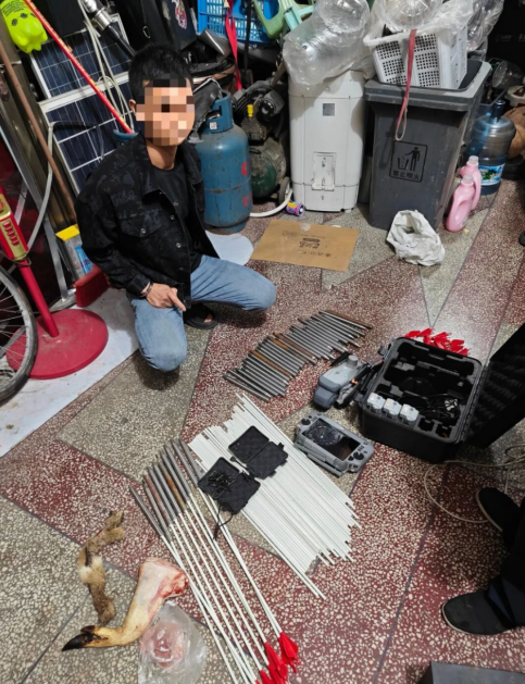 本年9月,湖南邵阳市公安局双清分局法式大队接到森警支队打发陈迹称造孽嫌疑东谈主李某、宁某二东谈主在新邵、邵东等地屡次勾结有“捕猎”醉心的村民使用无东谈主机罪人猎捕野活泼物,大队赶紧开导专案组。经研判分析,民警锁定了李某、宁某的当作规章通过连日跟踪与夜间蹲守,于10月13日将两名造孽嫌疑东谈主理获。并离别在二东谈主住处查获改装无东谈主机一架些许不锈钢“牙签”、箭体等禁用狩猎器具,以及两端已处罚的麂子冻体。